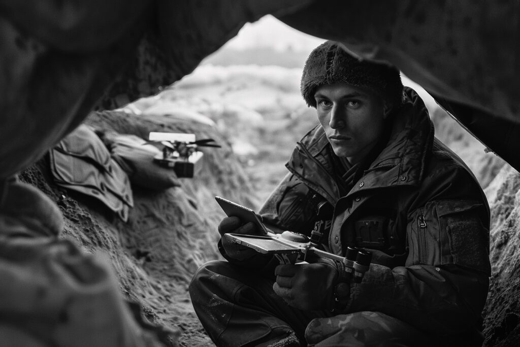 Ukrainischer Soldat in Schützengraben hält einen Prototyp-Quadrokopter. Foto: Unfold