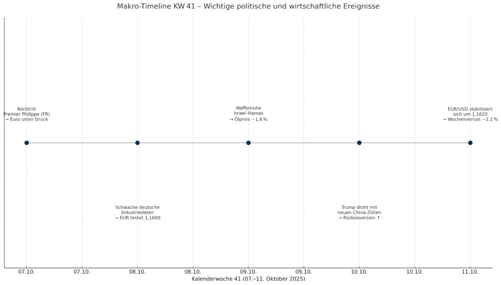 Die Kalenderwoche 41 war für den Euro von erheblichem Abwärtsdruck geprägt. Das Währungspaar EUR/USD verzeichnete einen Rückgang von rund 1,1 % und erlitt damit den stärksten Wochenverlust seit Juli¹. Der primäre Treiber dieser Entwicklung war eine Zunahme der politischen Unsicherheit in Europa, die das Vertrauen der Anleger in die Gemeinschaftswährung kurzfristig untergrub. Während der US-Dollar von seiner Rolle als sicherer Hafen profitierte, belasteten interne europäische Probleme den Euro stärker als externe geopolitische Faktoren.