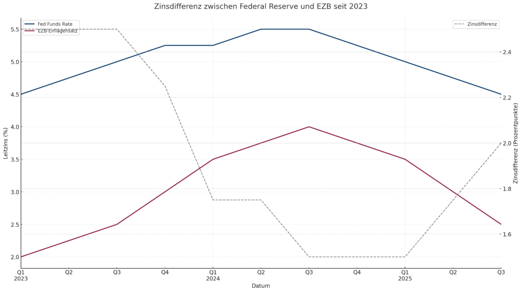 Diese geldpolitische Divergenz spiegelt die unterschiedlichen wirtschaftlichen Rahmenbedingungen wider. Die Eurozone leidet unter Stagnationstendenzen mit einem BIP-Wachstum von kaum 1 %, zusätzlich belastet durch externe Faktoren wie die US-Strafzölle¹². In den USA hingegen begründen klare Abkühlungstendenzen am Arbeitsmarkt den Kurswechsel der Fed hin zu einer lockereren Geldpolitik⁷.